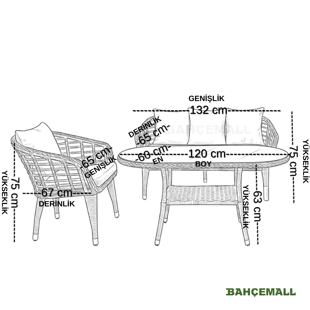 - 2'li Koltuk: Genişlik 132 x Derinlik 65 x Yükseklik 75 cm