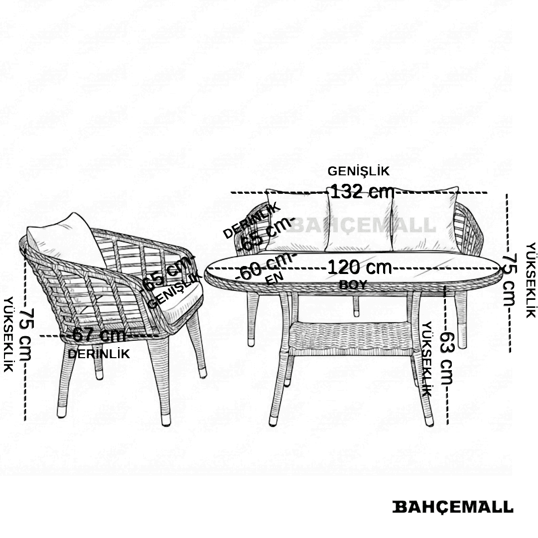 • 2'li Koltuk: Genişlik 132 x Derinlik 65 x Yükseklik 75 cm
