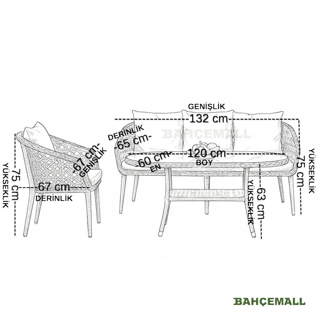 • 2'li Koltuk: Genişlik 132 x Derinlik 65 x Yükseklik 75 cm