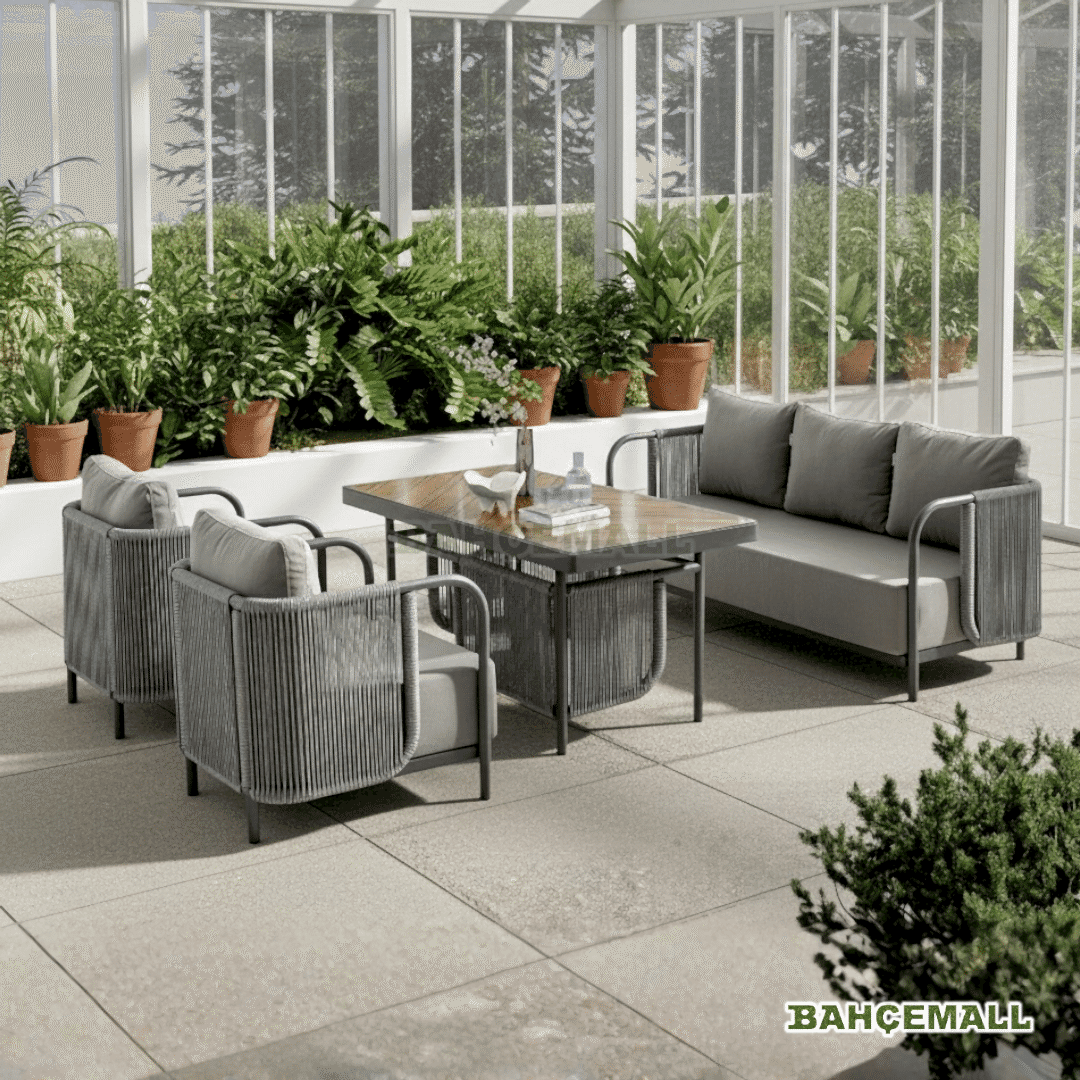 • Bu Amor Bahçe Mobilyası, bir adet Masa ve camı, iki adet Tekli ve bir adet Üçlü koltuktan oluşur.