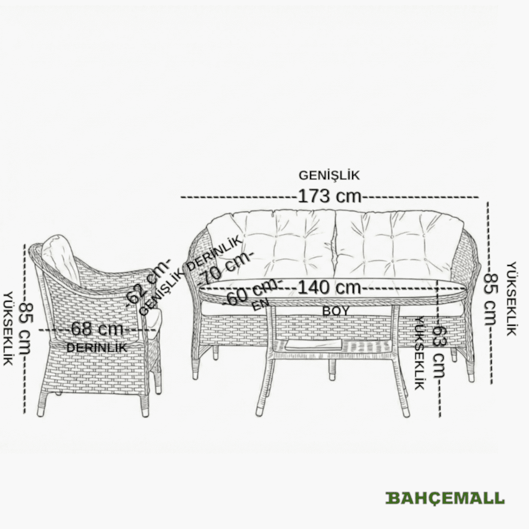 - 3'lü Koltuk: Genişlik 173 x Derinlik 68 x Yükseklik 85 cm