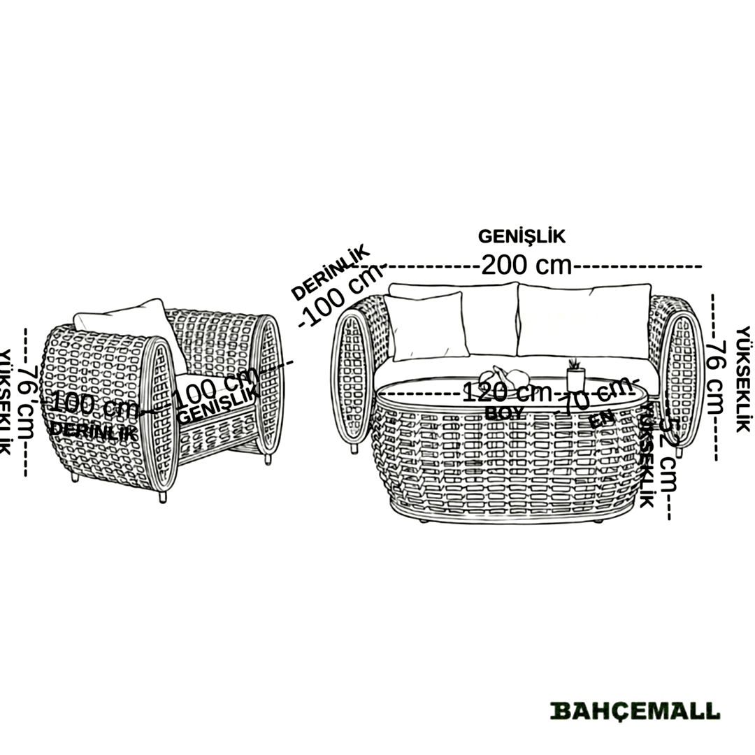 • 3'lü Koltuk: Genişlik 200 x Derinlik 100 x Yükseklik 76 cm
