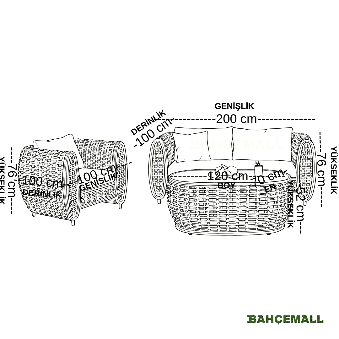 - 3'lü Koltuk: Genişlik 200 x Derinlik 100 x Yükseklik 76 cm