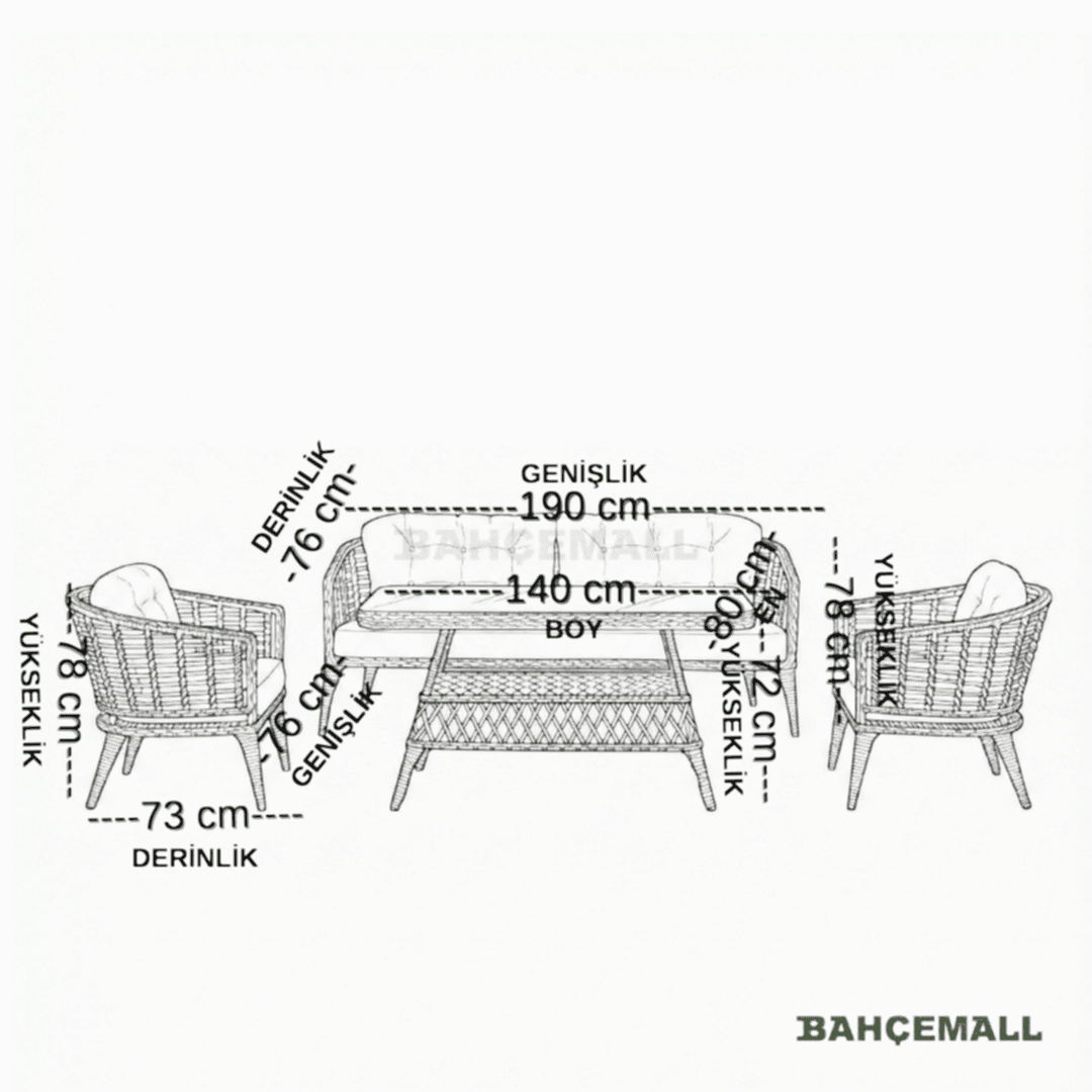 - 3'lü Koltuk: Genişlik 190 x Derinlik 76 x Yükseklik 78 cm
