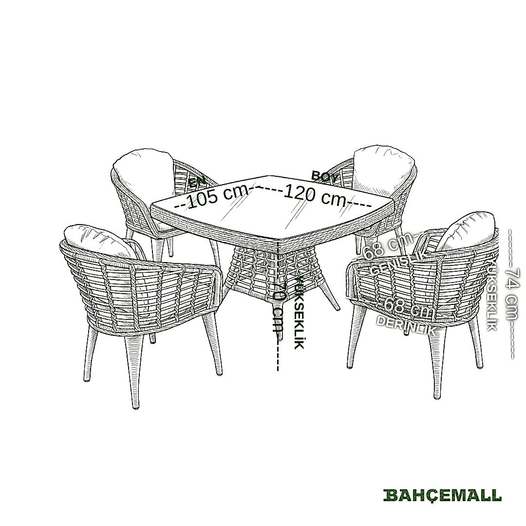• Bu Efes Bahçe Mobilyası, bir adet Masa ve dört adet Tekli koltuktan oluşur.