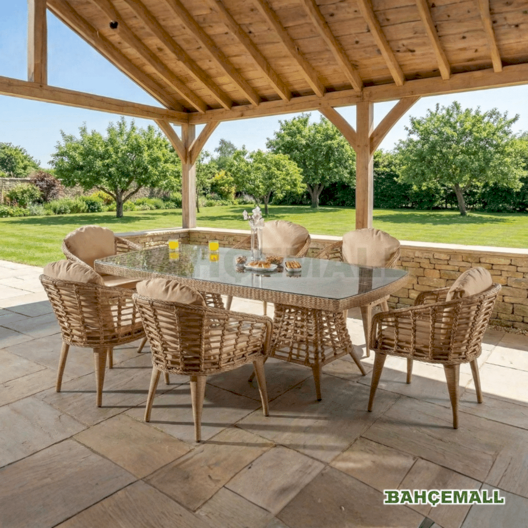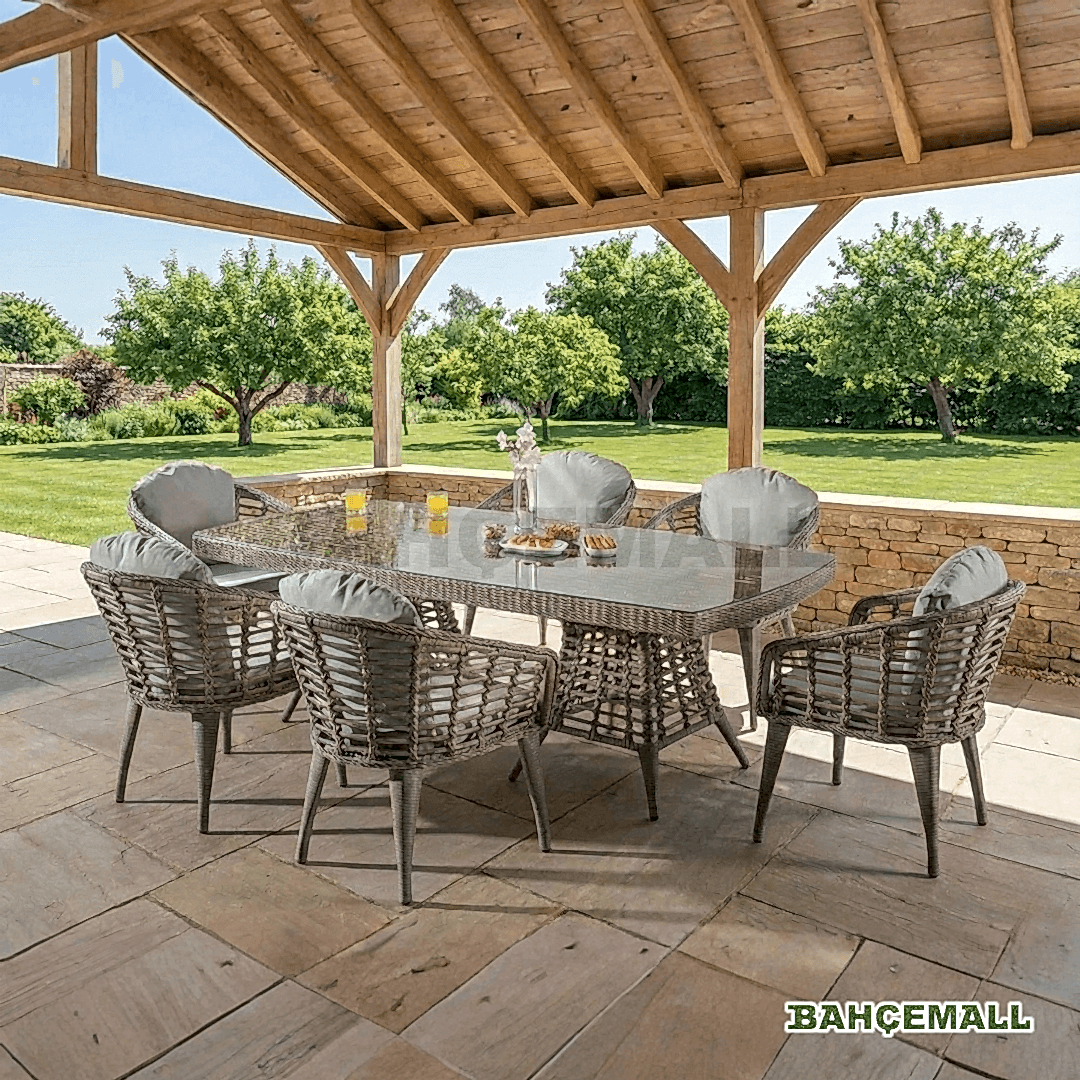 - Sehpa, dış mekana dayanıklı örgü malzeme ve temperli cam yüzeye sahiptir.